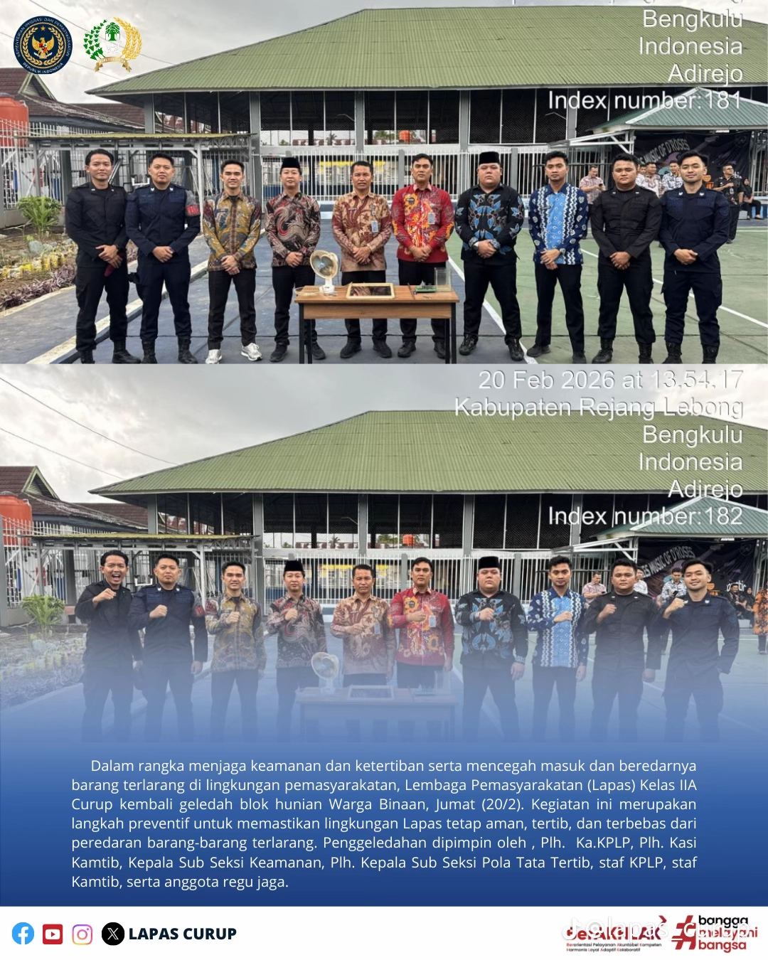 Curup, 21 Febuari 2026 – Lembaga Pemasyarakatan (Lapas) Kelas IIA Curup terus meningkatkan keamanan dan ketertiban internal dengan menggelar razia rutin di blok hunian Warga Binaan Pemasyarakatan (WBP). Razia yang dilaksanakan pada Jumat (20/2) ini bertujuan untuk mencegah masuk dan beredarnya barang-barang terlarang di lingkungan lapas.